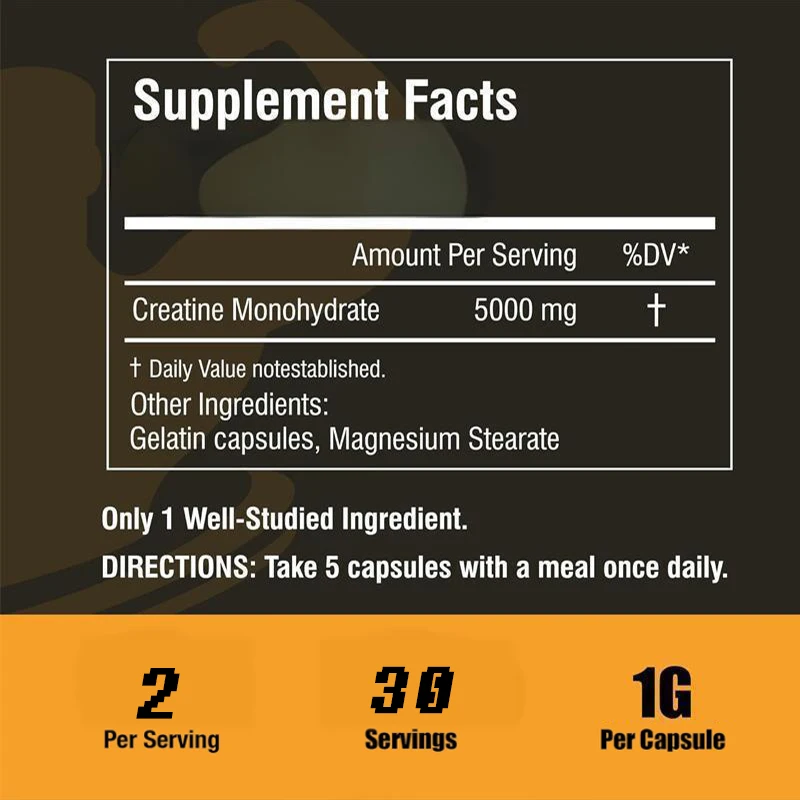 Capsule form – Each creatine capsule contains 1G of pure creatine, 2 capsules per serving, taken with a meal. 60 capsules per bottle, 30 portions per can. Suitable for monthly exercise nutrition supplements.