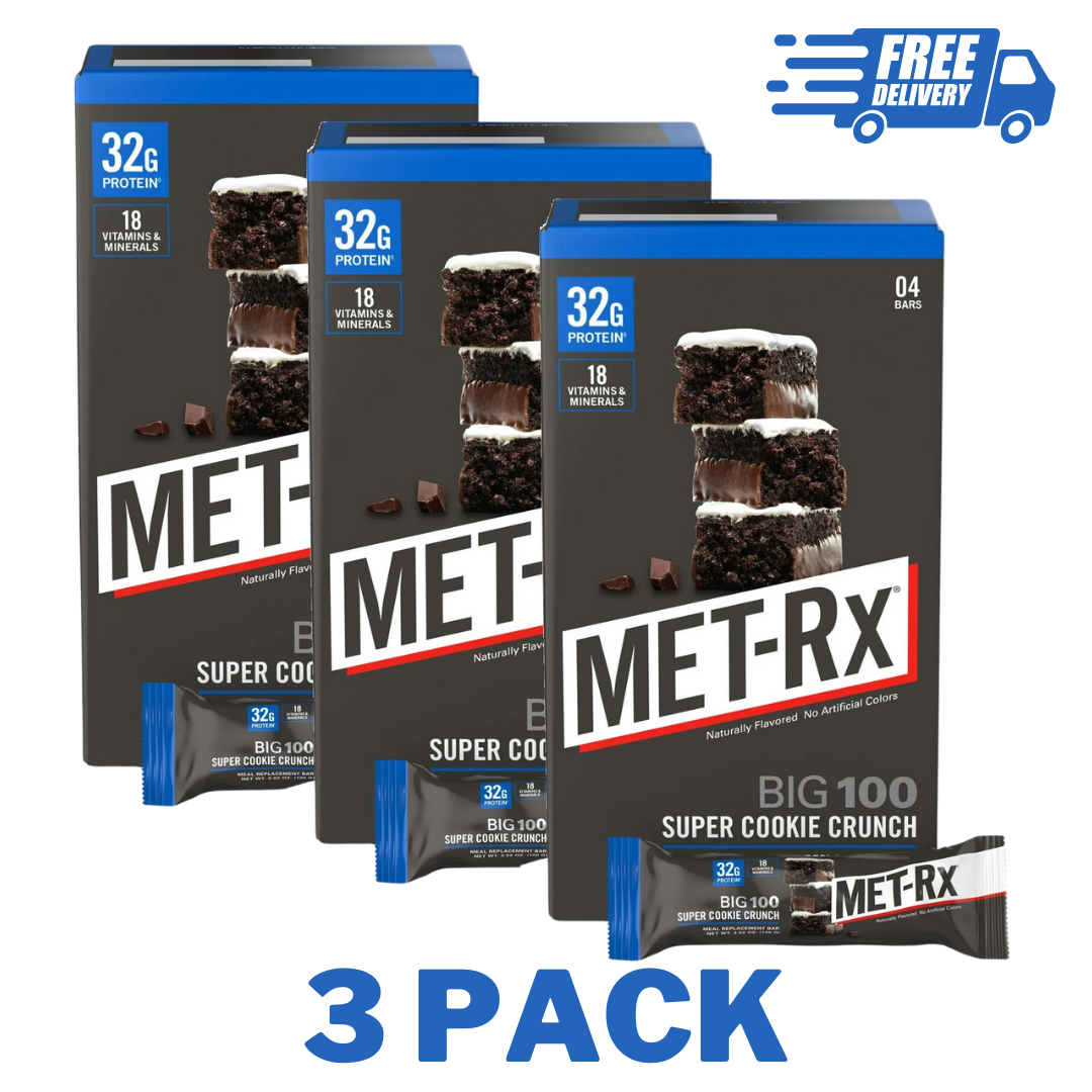 3Pack MET-Rx Big 100 High Protein Meal Replacement Bars Super Cookie Crunch 4 Ct