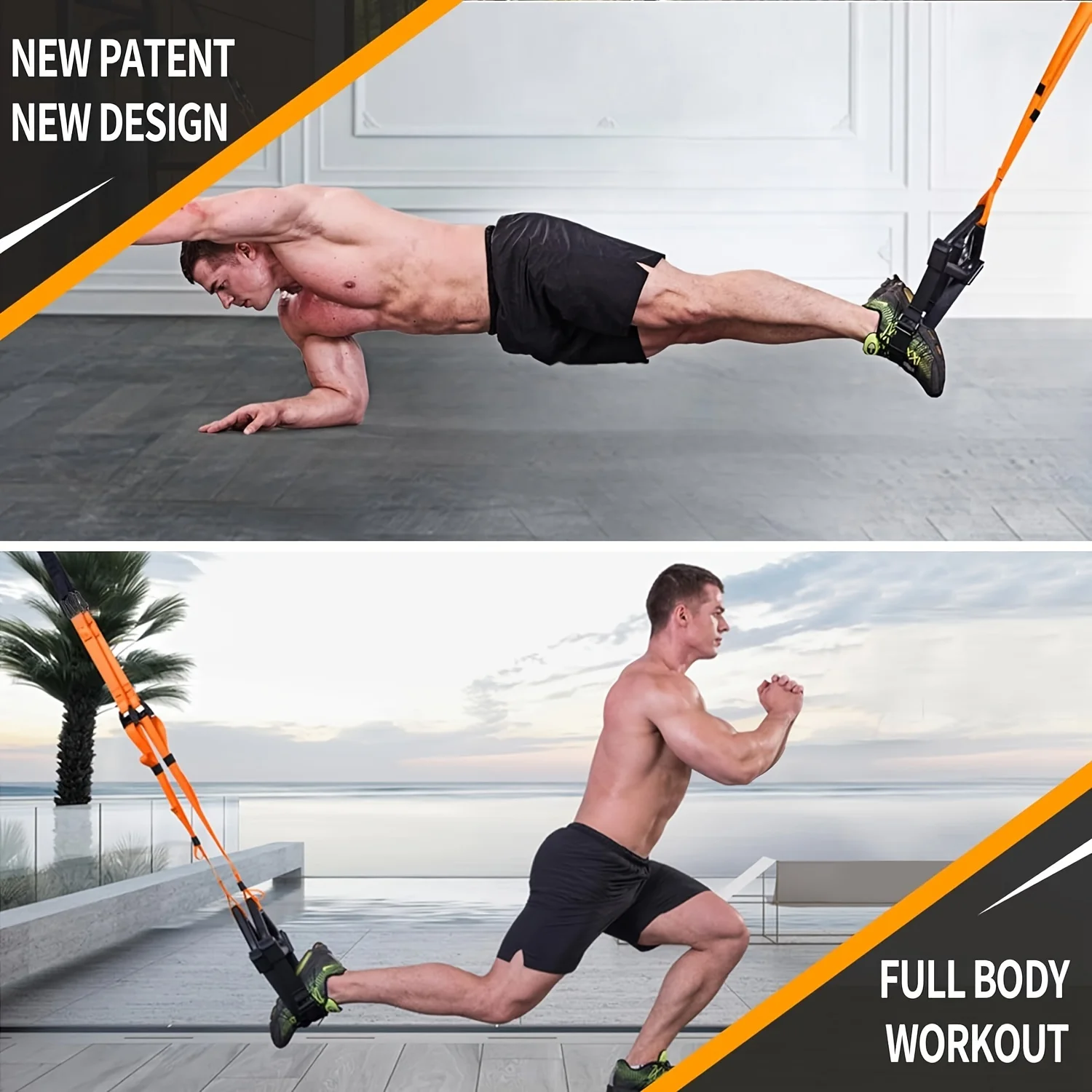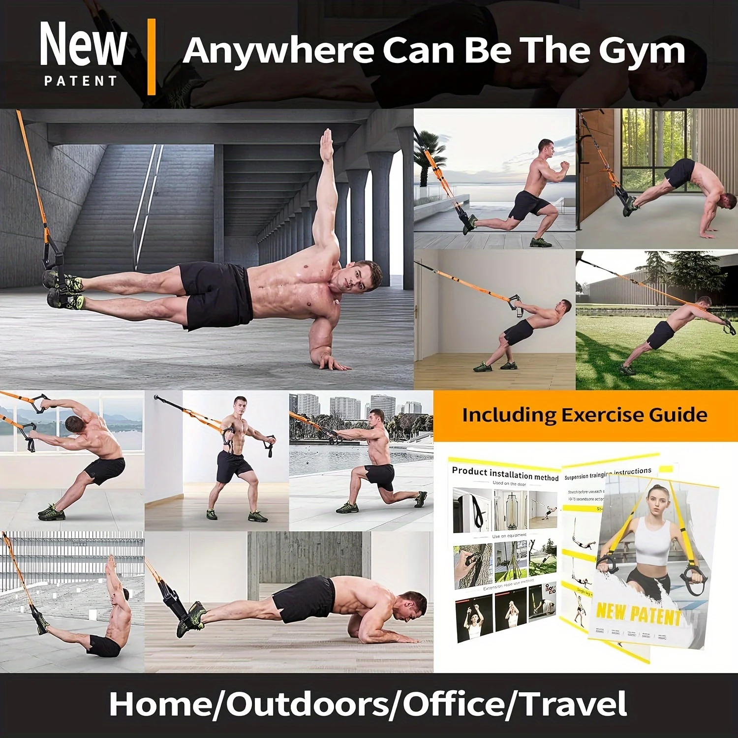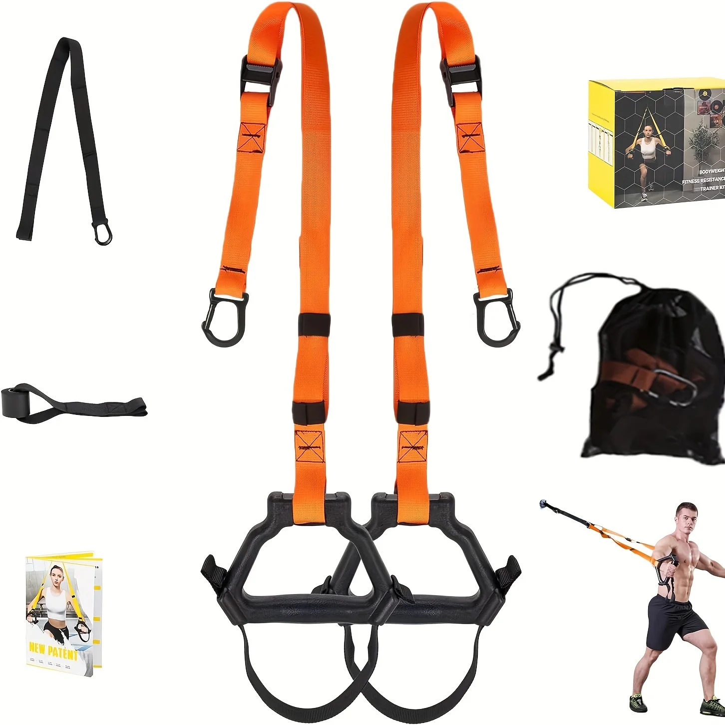 Ultimate Home Gym Bundle: Experience a full-body workout with our resistance training straps, featuring a complete set including bands, door anchor, extension strap, carabiners, mesh bag, and a detailed fitness guide for versatile at-home exercise routines