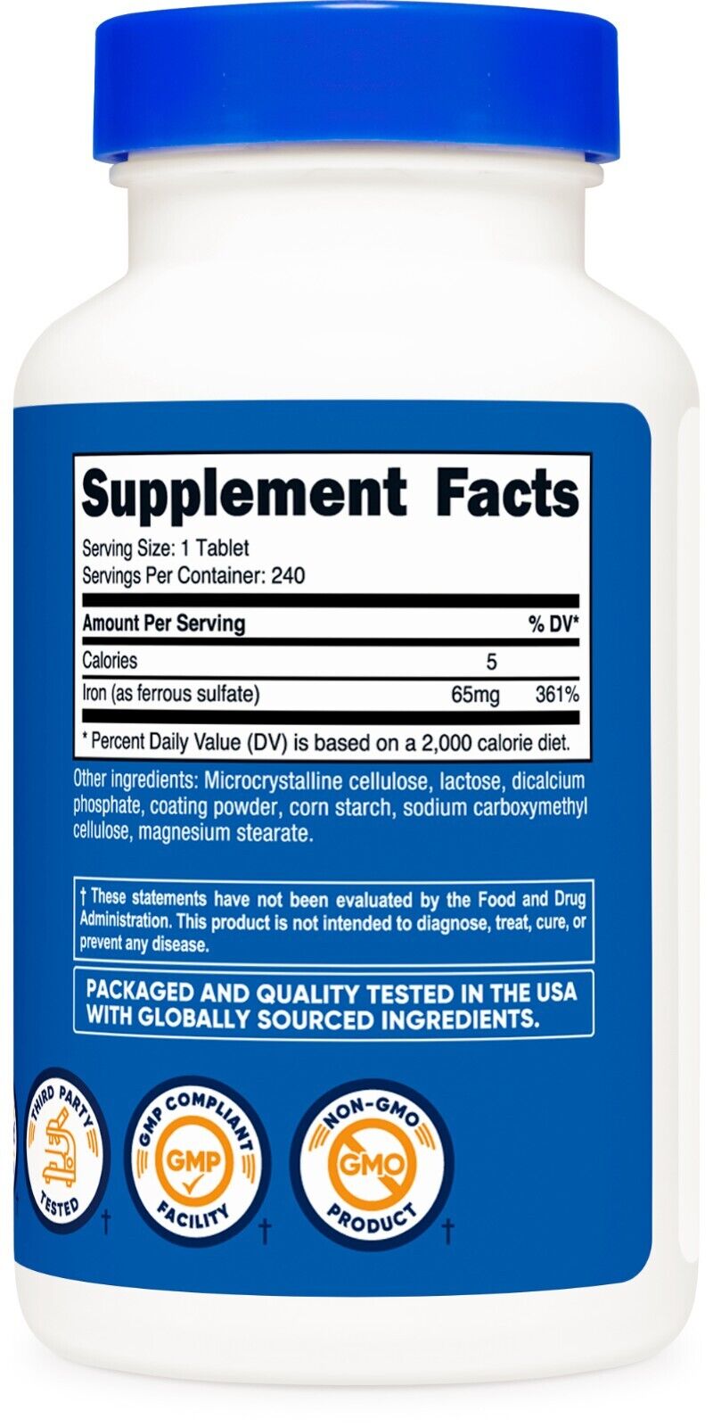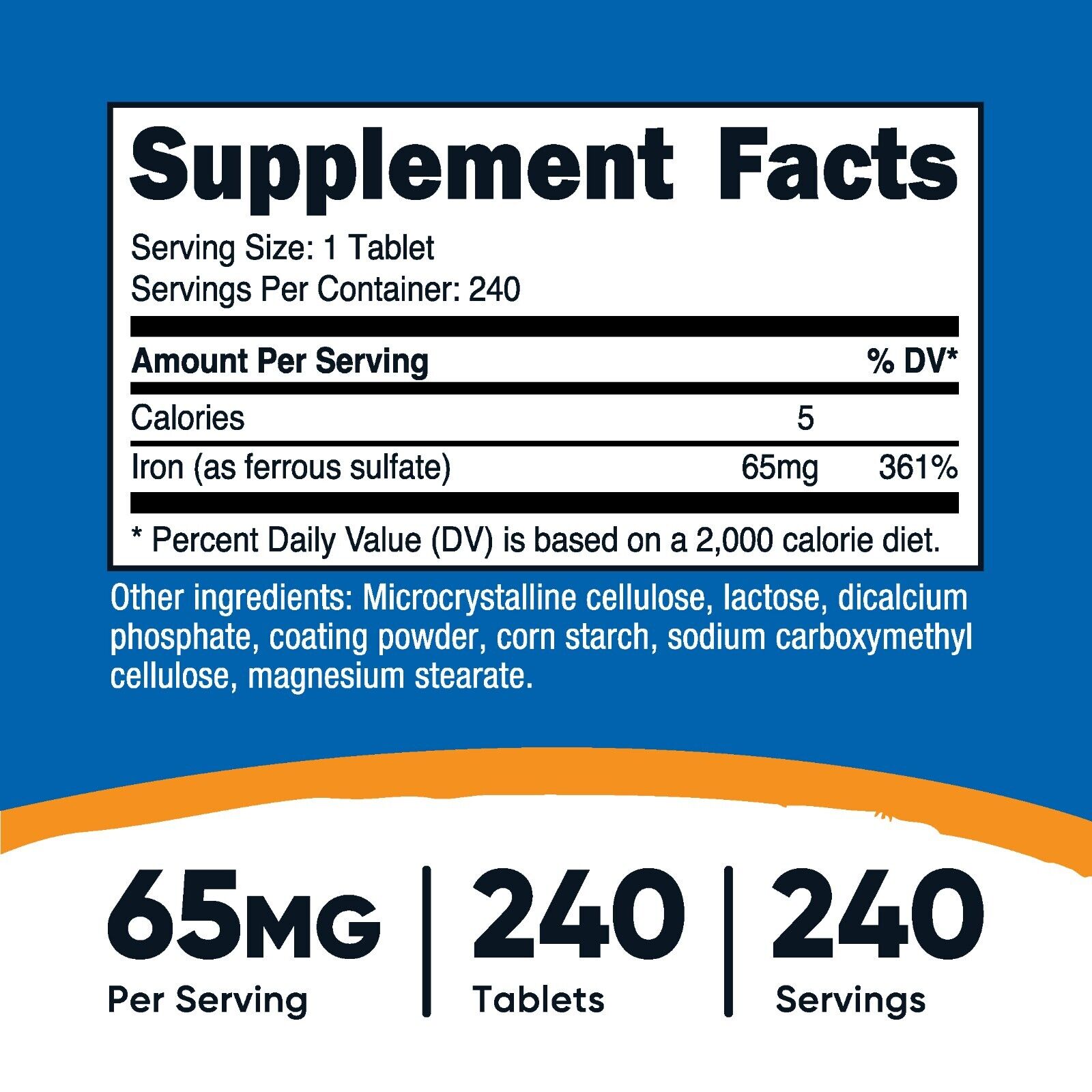 Each bottle of Nutricost Iron (as Ferrous Sulfate) contains 240 tablets (240 Servings). Each serving has 65mg of Iron.