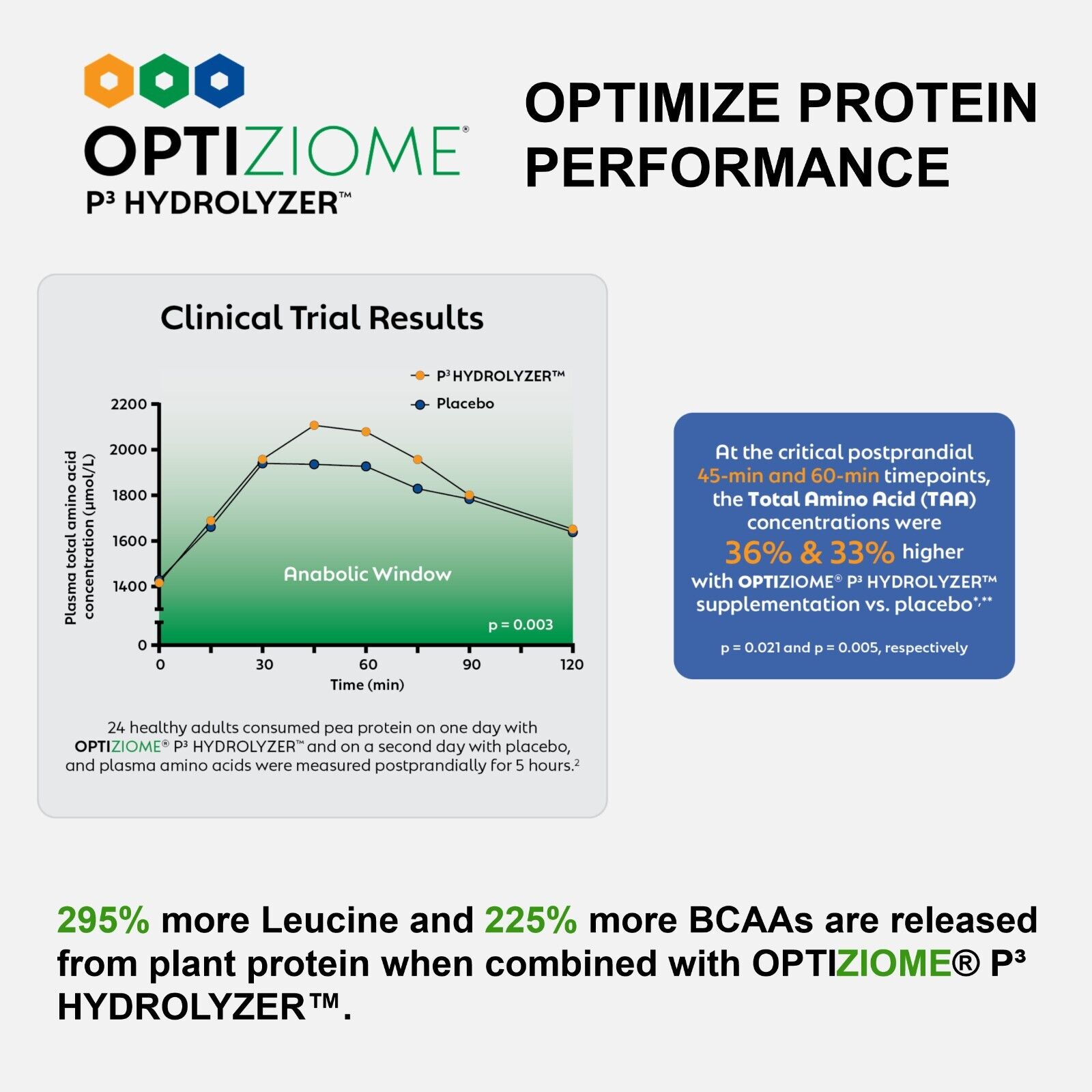 - OPTIZIOME P3 Hydrolyzer Digestive Enzyme: This amazing enzyme complex increases the plasma Total Amino Acid (TAA) concentrations by over 30% between 45-60 minutes after consuming a protein supplement.