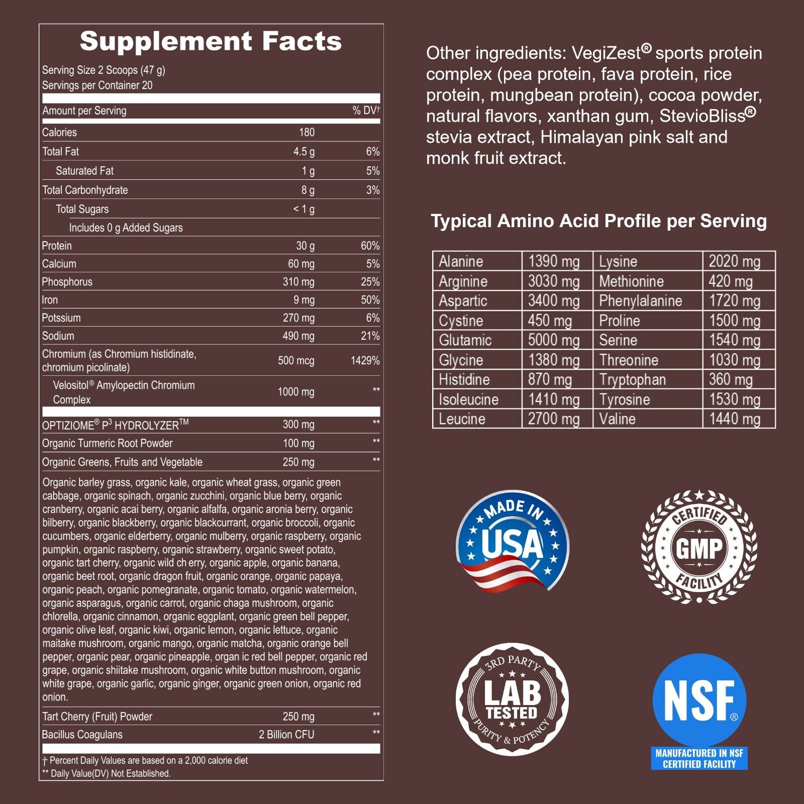 Phytonutrients in vegetables and fruits are powerful antioxidants. Active lifestyle demands more antioxidants to combat free radicals. Our gluten free protein powder contains 62 organic vegetables and fruits including tart cherry and turmeric root, supplying essential micronutrients for workout recovery.
