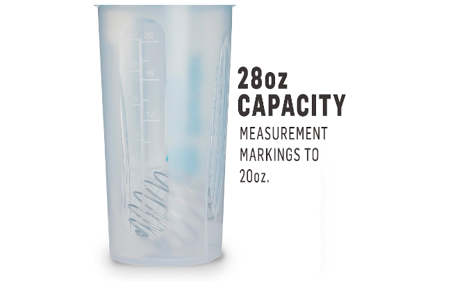 20-ounce capacity (note: measurements only go to 12 ounces) shaker cup for mixing protein shakes, smoothies, and supplements