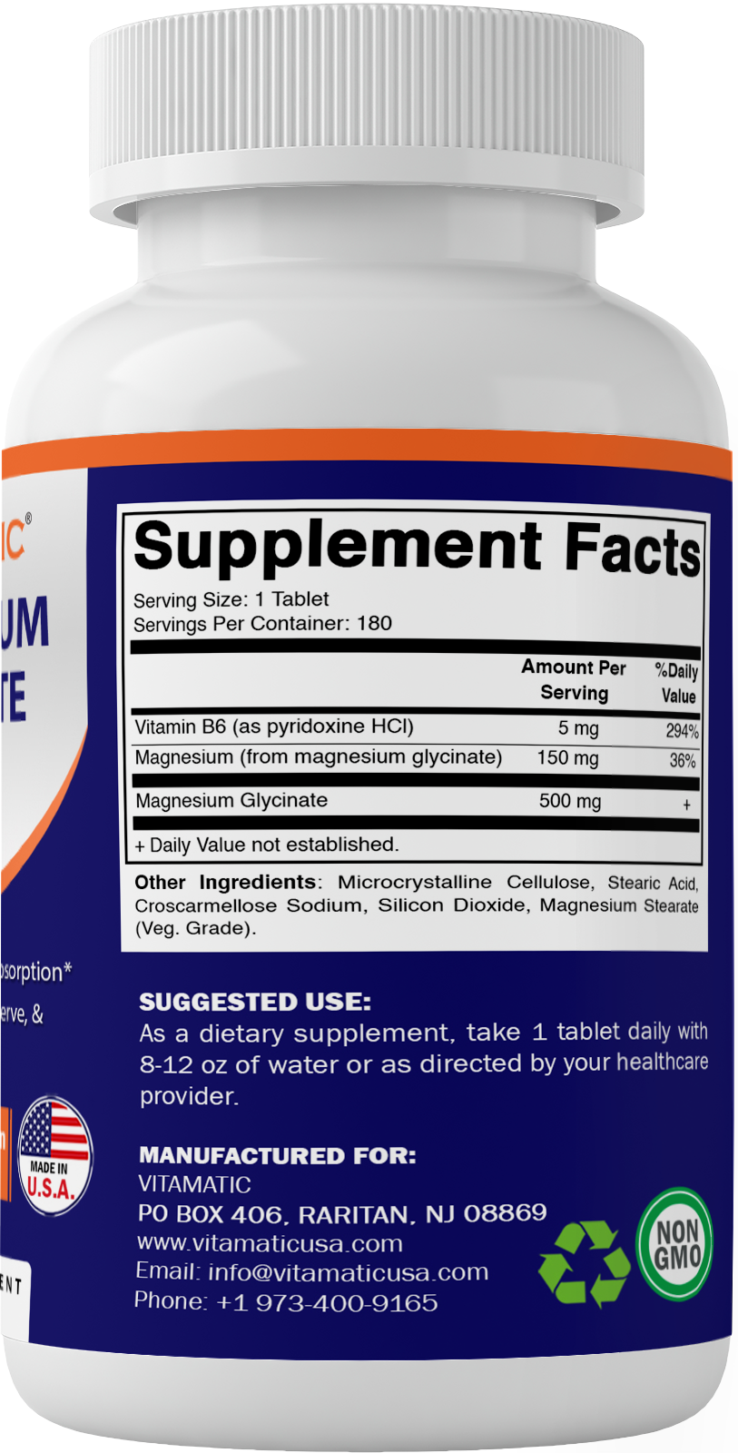 Magnesium Glycinate 500mg per Tablet – 180 Vegetarian Tablets (Uncoated) –