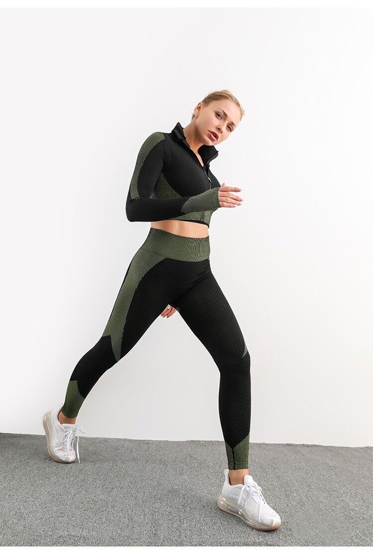 Women’s 2 Piece Tracksuit Workout Set High Waist Leggings ZIP Crop Top Gym Cloth